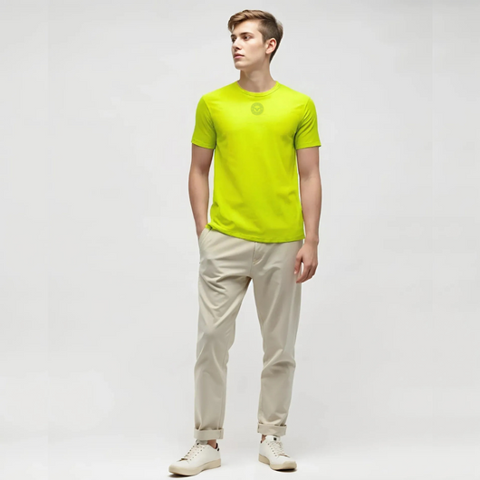 Short Sleeve Unisex T-shirt Design - Round Front & Back - Logo Reflected Neon Yellow - Slim-Fit - Round Neck - Round Bottom Style.